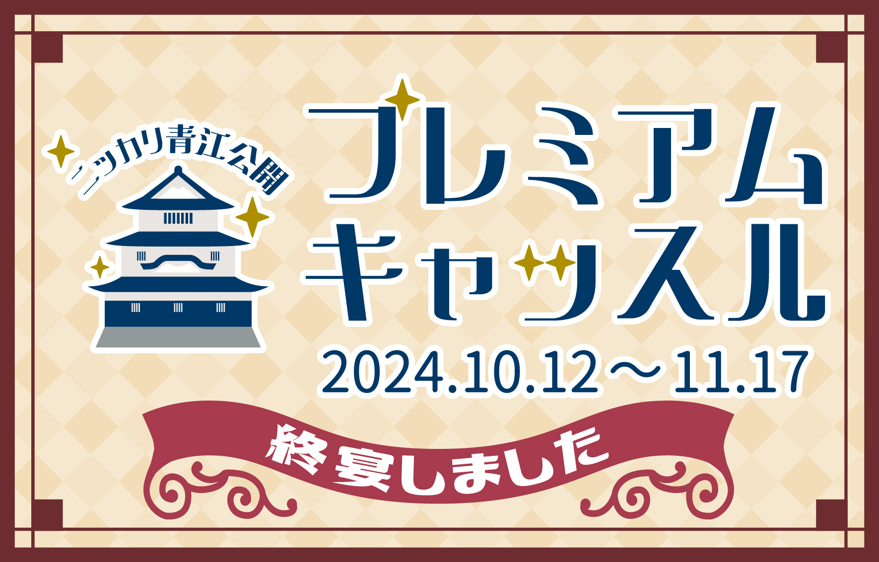 一覧を表示 INFO 2026/2/16 じゅうじゅう年賀状(令和8年版)の寄付金・・・ INFO 2026/2/4 まるがめDMO懇談会に参加してみませんか・・・ INFO 2026/1/12 【結果発表】第7回丸亀城一番福選手権 INFO 2026/1/12 第25回まるがめDMO懇談会を開催しまし・・・ INFO 2025/12/29 【募集締切】第7回丸亀城一番福選手権につ・・・ INFO 2025/11/28 【注意喚起のお願い】悪質サイト・偽サイト・・・ INFO 2025/11/27 丸亀城天守&中津万象園『共通券』好評販売・・・ INFO 2025/11/24 第24回まるがめDMO懇談会を開催しまし・・・