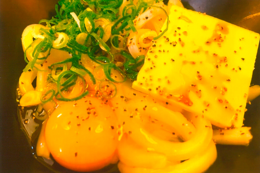 熱々の釜から上げだうどんに、バターと生卵、黒胡椒で食べると、コレがまた美味い!癖になる味です!